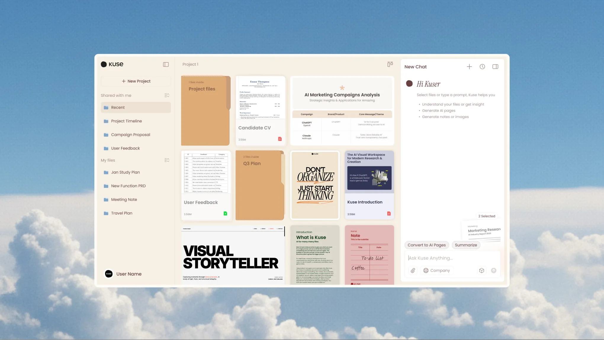 Kuse is your cloud-based digital coworker that organizes your files and turns messy stuff into a structured, AI-powered knowledge base.