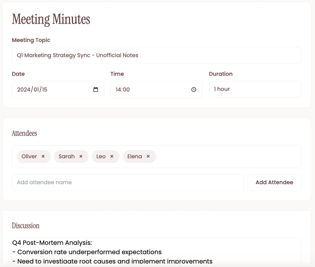 Extract themes, key points, and action items from meeting notes, interviews, or lecture recordings.